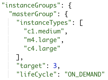 2. Under the attribute mrScaler.compute.instanceGroups.masterGroup, change target to 3 and lifeCycle to ON_DEMAND.